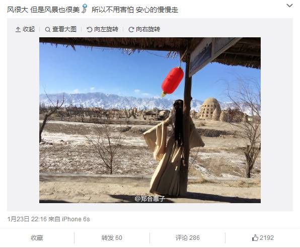 如果说吴磊与陈翔搞笑范十足的话,那么两位菇凉则是女神范儿十足,郑合惠子被眼前的风景所吸引,拍出美美哒背影照,张予曦则晒起剧照,表示要做自己喜欢做的事情,努力把戏演好~