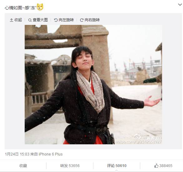 吴磊前些天银川下的那场中雪让吴磊感“冻”不已,虽然气温直逼零下20度,但小鲜肉的心情似乎因为这场雪变得美美哒~