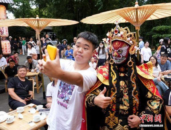 10月2日,四川成都,游客和川剧变脸演员合影留念。中新社记者 安源 摄