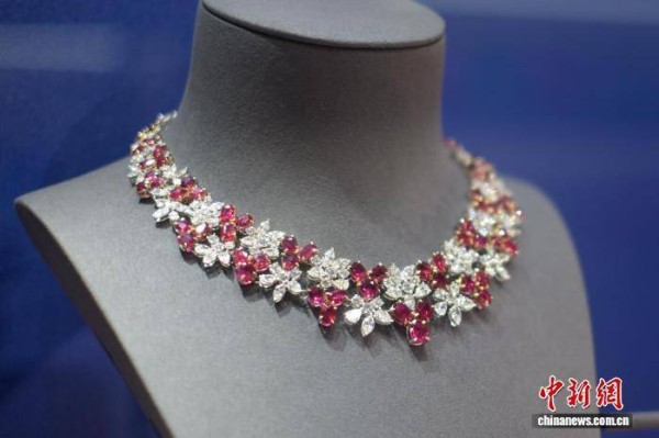 10月3日,中国嘉德香港2025年秋季拍卖会在香港会议展览中心举行。本届拍卖会涵盖六大板块,包括中国书画、亚洲二十世纪及当代艺术、瓷器工艺品、金石雅玩及古典家具、珠宝钟表尚品与生活尚品,呈献超过2000件艺术珍品,总估价超过4.8亿港元。图为总重约80.76克拉未经加热处理的缅甸鸽血红的红宝石配钻石项链。中新网记者 陈永诺 摄