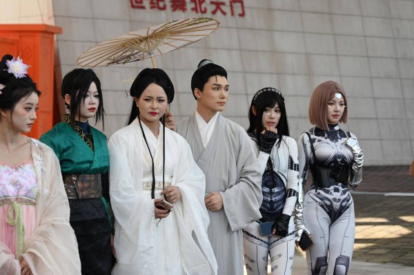 当日14:00,巡游队伍正式亮相。手持混天绫的哪吒、白衣俊朗的敖丙刚一登场,便引发热潮;银灰金属质感搭配流光线条的机械姬,以浓郁科幻风吸引目光,尽显成都科创魅力;青城山白蛇IP队伍则满溢温婉气韵;三国IP队伍中,威风凛凛的刘关张三兄弟、手持羽扇颔首致意的诸葛亮,更让青少年争相上前合影……
