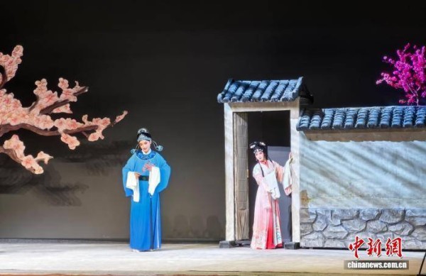 图为经典桂剧《人面桃花》在观众面前演出。该剧题材取自唐代诗人崔护的诗《题都城南庄》,讲述一段美丽的爱情故事。蒙鸣明 摄