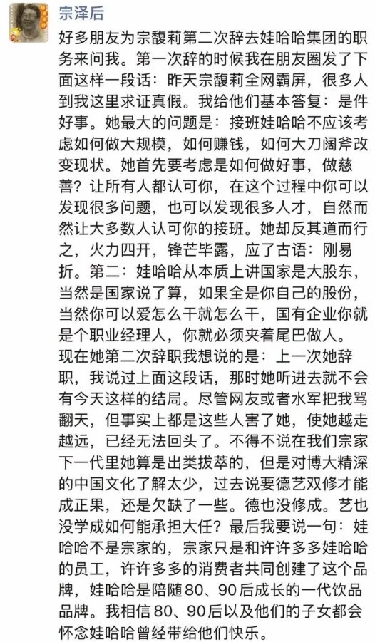 宗泽后发文回应宗馥莉辞职称其锋芒毕露刚易折