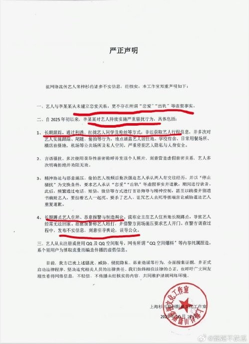 荣梓杉方称李禹熹长期蹲点艺人住所 导致艺人无法回家荣梓杉被指出轨家暴,前公司解约纠纷再引关注