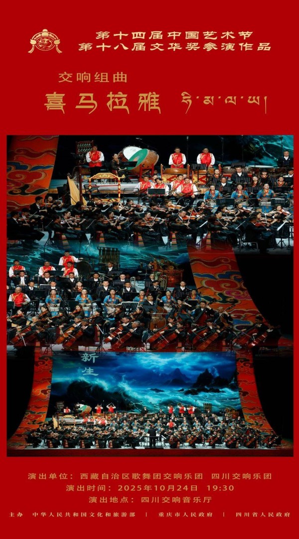 第十四届中国艺术节参演作品交响组曲《喜马拉雅》将于2025年10月24日19:30,在四川交响音乐厅震撼上演。这部作品由丹增贡布老师提议策划,汇集格来、扎西次旺、边巴、贡嘎伦珠、吴坚顿珠、普布次仁老中青多位作曲家共同创作,旨在通过音乐语言讲好西藏故事,传递高原人民对祖国的热爱与祝福。此次参加中国艺术节,既是向全国展示西藏文化发展成就的窗口,也是促进各民族文化交流互鉴的重要平台。