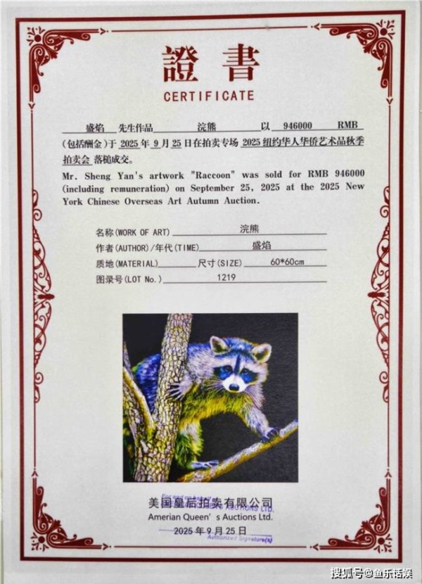 "中华镜面光雕画之父"盛焰博士的两幅作品《浣熊》与《亲热》,正以刀锋雕刻的光影韵律,在西方艺术市场掀起一场东方美学的风暴,让全场藏家的呼吸都随着竞价阶梯同步起伏。