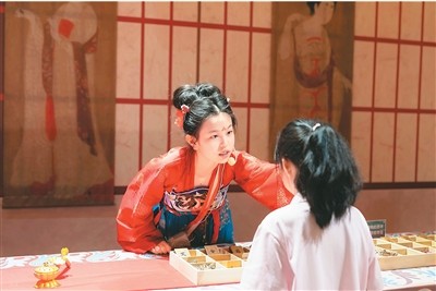 “露华浓深——大唐生活美学展”社教体验区,小讲解员为参观者贴花钿。
