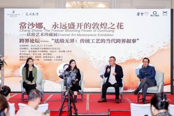 下午四点,四位受邀嘉宾在北京丽思卡尔顿酒店宴会厅,开启 “珐琅无界——传统工艺的当代跨界叙事” 主题论坛。展览出品人杨絮子作为论坛主持人:邀请常沙娜工作室北京总部总经理,敦煌常沙娜艺术中心主任曾薇瑄女士首先就常沙娜先生的艺术人生和敦煌文化以及常先生对珐琅艺术的热爱进行了分享; 随后展览总策划,北京荣会文化董事长宋宁颉先生则讲述了常沙娜先生展览作品的工艺与审美及珐琅的独特价值;X美术馆馆长尤洋先生讲述了美术馆作为美学传播机构,在敦煌文化美学的传承与创新方面的思考以及非遗商业跨界的价值分享。