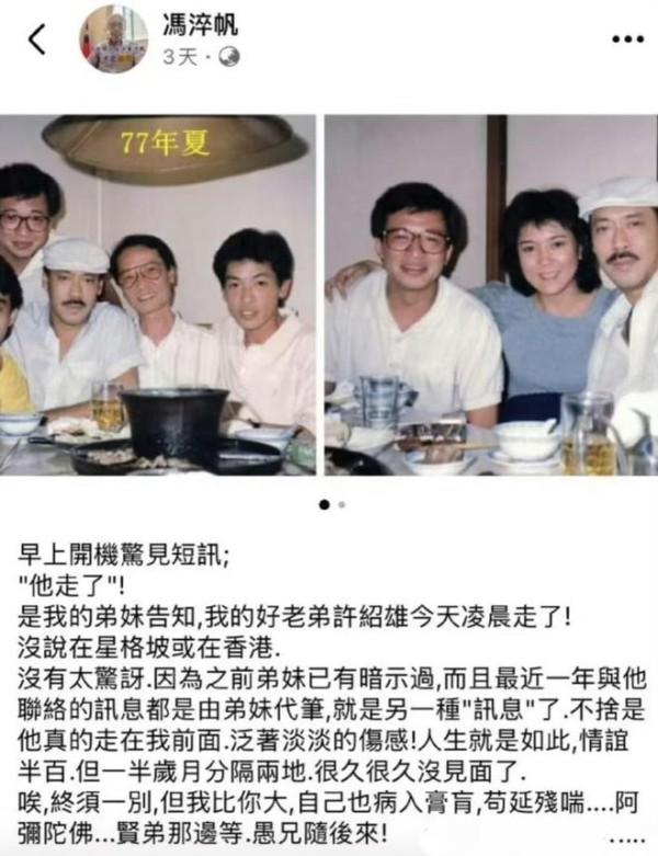 其中就有此前同在香港娱乐圈发展的冯淬帆,两人私交甚好,老友的离去让冯淬帆无比心痛,但又坦然,他也知道自己时日无多,因此发文略显凄凉。