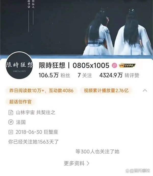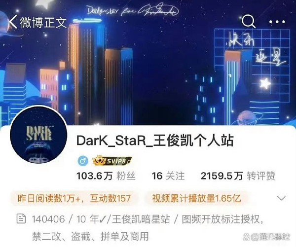第四位是王俊凯的“暗星”。粉丝量113.9万。她长期跟拍王俊凯,内容以工作纪实为主。冷静克制,少有情绪化表达。她的存在证明,单人艺人也能支撑顶级站姐生态。