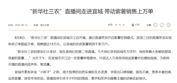 推宜城紫薯时,3天卖出上万单;售利川红茶,9小时卖完682万元库存,相关话题#新华社助农#阅读量轻松破亿。