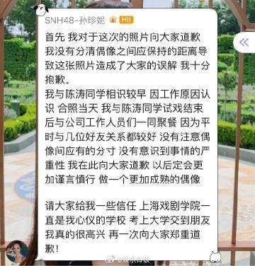 孙珍妮发文道歉 承认与陈涛亲密照承诺保持一定距离