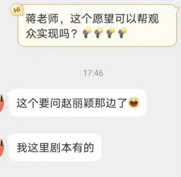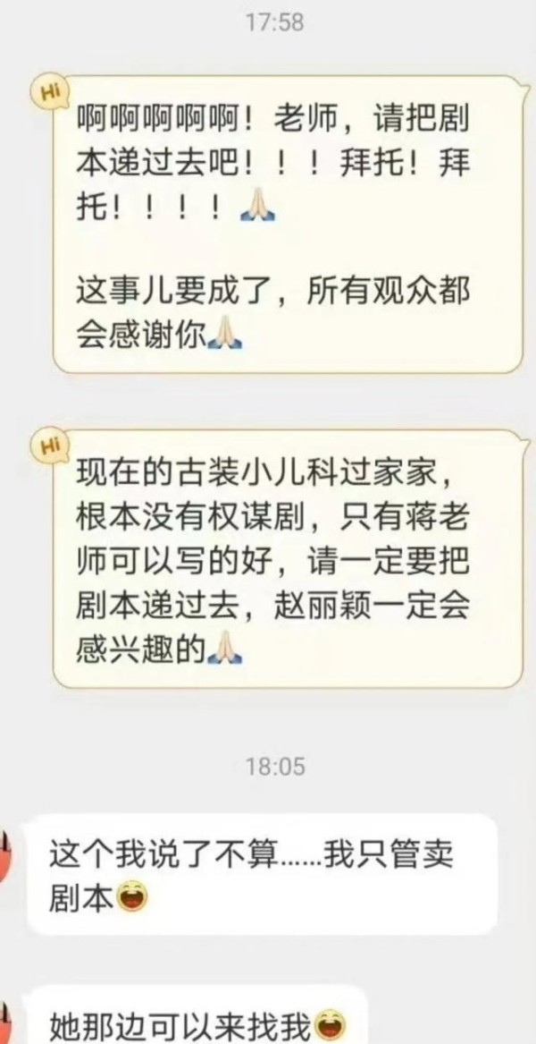 赵丽颖粉丝向蒋胜男恳求给赵丽颖剧本,而蒋胜男方表达了礼貌的态度,想要将自己的剧本卖出,但并不是在直接邀约赵丽颖。