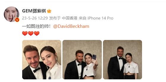 5月26日,邓紫棋和世界足球巨星贝克汉姆在微博上晒出了一张合照,让整个娱乐圈都为之惊讶。邓紫棋在微博中赞扬贝克汉姆“一如既往的帅!”而贝克汉姆也表示很高兴见到邓紫棋。