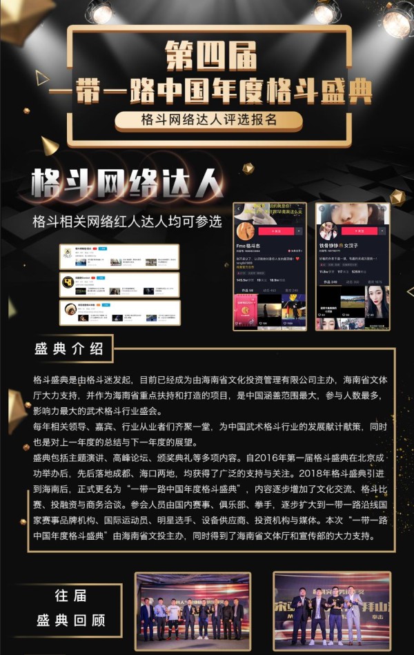 而第四届一带一路中国年度格斗盛典即将起航,在最引人注目的颁奖典礼中,也将首次加入“格斗网络达人”的奖项。