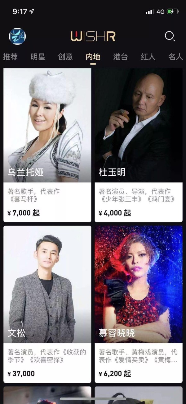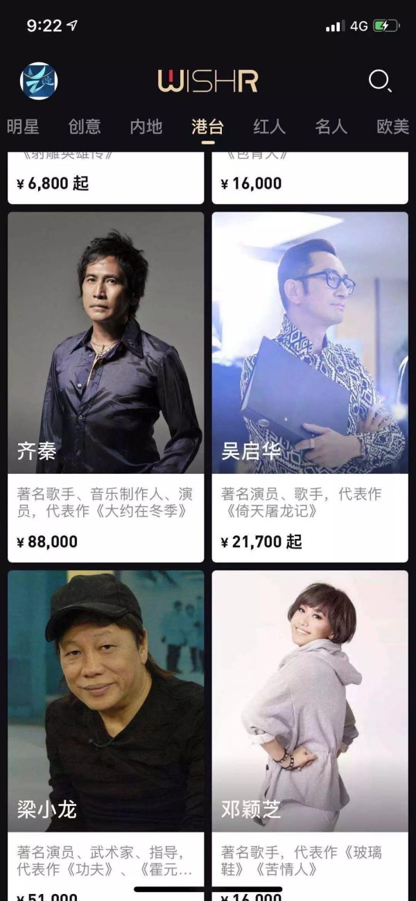从平台展示案例来看,价格便宜的明星似乎更容易交易成功,许多开价数万元的明星并未展示成功交易案例,看来消费明星祝福视频的顾客对老的演员、歌手、艺术家比较熟悉,也十分在乎这祝福背后的性价比。