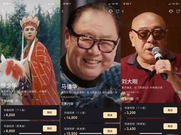 因为86版《西游记》中的唐僧饰演者徐少华和《大话西游》中的唐僧都在这个平台上有报价,有人笑称“只要不到两万元,就能让两个唐僧为你祝福。”当然“沙师弟”和“猪八戒”的祝福也都是明码标价的。