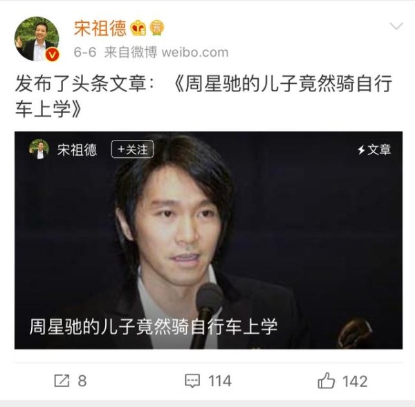 宋祖德这个人其实说让人反感也挺反感的,但是让人喜欢又挺喜欢的(小编也说不上来为什么),可能让人反感的就是他有些时候说的事情是虚假谣言,打个比喻就那他有一篇文章是说周星驰有私生子,而且还不让私生子做豪车必须要自己骑单车去上学,这一篇就是造谣,网友周星驰从来没结过婚,连恋爱史都没有这么可能会有私生子。