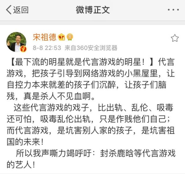 宋祖德:封杀为游戏代言的明星,以正社会风气,网友:支持宋老师