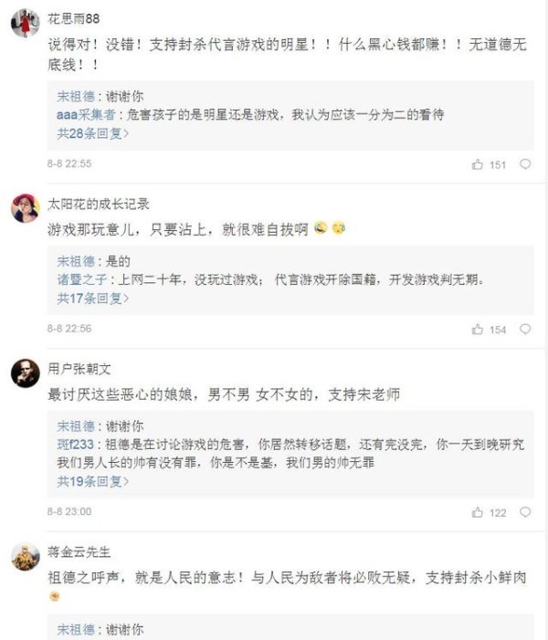 很多网友看到纷纷表示支持宋老师并表示:支持封杀那些代言游戏的明星,这些明星不知道误导了多少孩子,为了赚钱什么样的黑心钱都敢赚,真的是无道德无底线。
