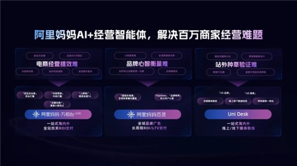 电商的本质是实现精准高效的人货匹配,所以,AI电商时代的双11冲刺期,就是AI大显身手的主场。天猫双11十余行业跑出了多个领跑品牌,虽然它们的具体策略、节奏不尽相同,但有一点却是共通的:积极拥抱AI,深度应用了“超级经营智能体”——万相台AI无界,这个根植于万亿级参数大模型(LMA2)的智能体,具有货品全站推、关键词推广、人群推广与内容营销四大核心能力。最新数据显示10月1日-10月31日期间,「货品全站推」助力20万+商家成交增长20%+,百万商品成交增长30%+。AI驱动的人、货、词、内容等全链路提效能力正在全面释放,万相台AI无界不仅能帮商家快速冷启动新品,精准识别、高效转化高增长潜能新客,更善打造爆款内容、竞逐搜索心智,实现品效合一。
