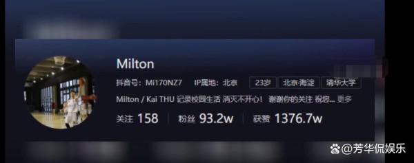 男大学生的身份也被网友们扒了出来,是位来自清华大学的Milton,身高颜值那也是没话说,在张凯毅之前自述中,她在认识第一天就直接表白了,第二天就把Milton强吻了,之后对于她来说也是手拿把掐信心满满,相识到最后确定关系仅用了144个小时。