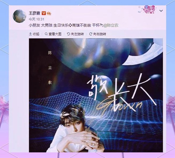 通过部分微博截图,我们可以看到,首位向陈立农致以生日祝福的并非队友蔡徐坤,而是王彦霖。王彦霖在微博中写道:“小朋友,大男孩,生日快乐,高雄不倒翁干杯。”并附上了陈立农的“敬长大”单曲封面。这条微博不仅表达了王彦霖对陈立农的生日祝福,还巧妙地宣传了陈立农的歌曲,可谓一举两得。