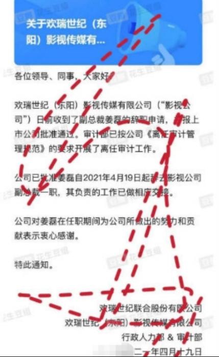 4月19日,欢瑞公司一封内部公告曝光,公告显示欢瑞副总裁姜磊近日提出辞职申请,公司已批准通过,审计部已开展了离任审计工作,还感谢了姜磊在任期间对公司做的努力和贡献。据悉,姜磊曾任欢瑞世纪影视传媒股份有限公司副总裁,兼管欢瑞经纪和欢瑞营销。曾捧红了李易峰、杨洋、陈伟霆、杨紫、任嘉伦、秦俊杰等演员,是我国80后最早一批从事影视行业的代表人物。在节目《演员的诞生》中姜磊直接骂郑昊戏霸,直言欧阳娜娜演技好。