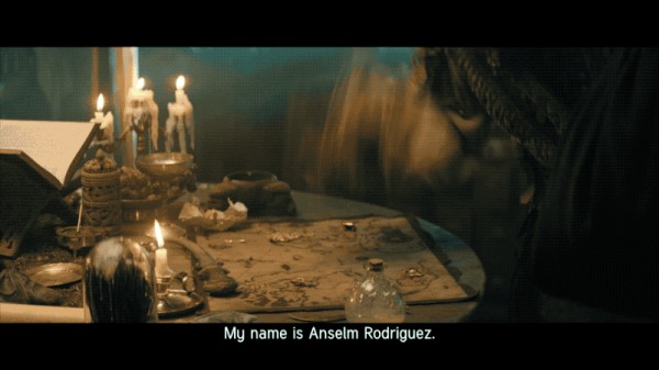 画风一转,德普将来访者拉近屋内,空洞无神的双眼,破烂的衣衫,披肩上的珠宝装饰,一根异国情调的羽毛,饱经风霜的冒险家形象跃然纸上,牢牢抓人眼球。