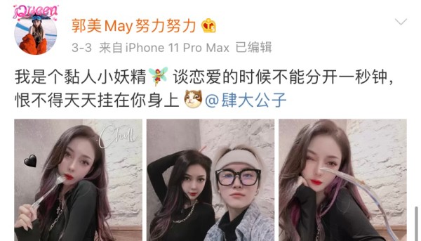 不过这条微博的发布时间是3月9号,已经有将近十天没有更新,这实在不太像郭美美的作风。毕竟在她曝光了恋情以后,几乎每天都会艾特女朋友秀恩爱,除了发表合照之外,还会发一些二人恋爱中的小日常。