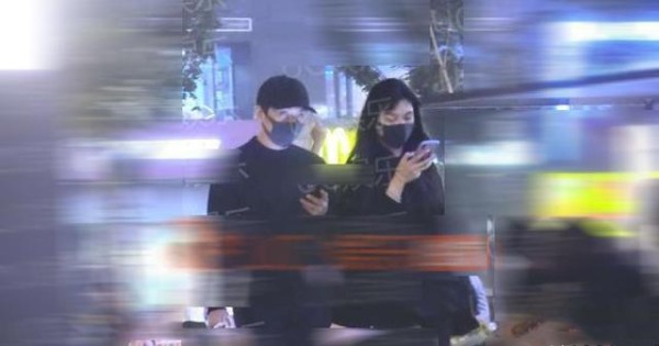 照片中的武艺一身黑色,还带上了帽子和口罩,并搂着女方,还有一张是两人拥吻的照片。