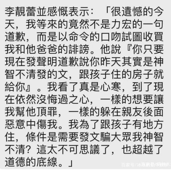 现在双方各执一词,王力宏的爸爸站出来,说女方靠怀孕上位。而李靓蕾则说自己这么多年,遭受王力宏和他家人的不断地怀疑、羞辱和冷暴力。我觉得,此时不要看两方都说了什么,只看结果就好。结果就是,所谓的“优质偶像”王力宏出轨了,而且不止一次、不止一个人,这就是最好的证明。