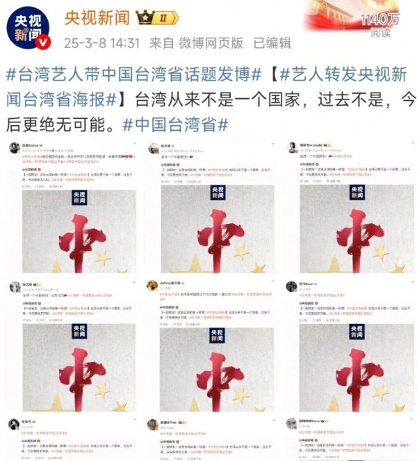 张韶涵、赵又廷等台星转发“中国台湾省”,周杰伦蔡依林等未转发