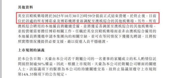 10月27日,澳博控股宣布,澳娱综合与天豪相互同意及订立终止协议,该协议将自2025年10月31日起提前终止。于终止后,天豪将不再向澳娱综合提供服务,英皇宫殿娱乐场于10月30日23时59分提前正式结束营运。