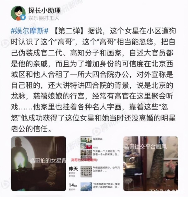 据媒体透露着一位被骗的女明星是在自己小区里认识了这一个高哥,而高哥也是说自己是官二代,是一个知识分子和画家,于是就获得了女明星的信任。