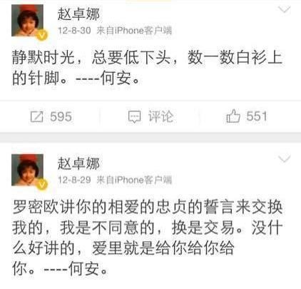 直到2012年,赵卓娜一不小心被人曝光了,她突然停止了写情书,但在此之前,包括韩寒婚后,她的所有微博内容都是关于他,唯一点赞过的地点也是他开的餐厅。