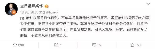 卓伟继续发文称,PG1被封杀那是自作自受,不单单我要爆他吃饺子的原因,真正被封杀的是因为他的歌极不健康,把正常小朋友带成了脑残,就算不吃饺子他被封杀也是必然的,他的粉丝也不要辱骂我的粉丝了,骂我归骂我,别见人就喷,希望PG1的粉丝早点醒悟,不然你永远是垃圾人。