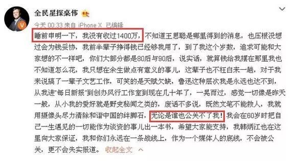 微博原文:睡前申明一下,我没有收过1400万,不知道王思聪是哪里得到的消息,也压根没想过会为钱妥协,我前半辈子挣得钱已经够我用了,到了我这个岁数,追求可能和大家想的不一样吧,你们大部分都是80后与90后,说实话,就算钱给我摆在那里我也不知道怎么花,我只想在余生做点有意义的事儿,这辈子也不枉白来一趟,对于我来说搞了一辈子文艺工作,可笑的是天赋欠缺,鲁迅这种层次我是永远也达不到,从我进“每日新报”到创办风行工作室到现在几十年了,一晃而过,感觉一切像是昨天一般,从小我的爱好就是野史秘闻之类的,废话不多说,既然文笔不能救人,我就用摄像头尽力清除和谐中国的绊脚石,无论是谁也公关不了我!我会在60岁时把自己一生遇见的一切能作为谈资的事儿出一本书,希望大家能支持,我韩炳江也在这里向大家保证,我和你们永远在一条战线上,作为一个媒体人的底线,不会被公关,更不会失实报道。