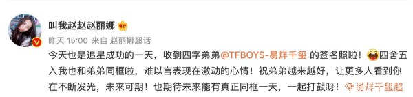 文中写道:“今天也是追星成功的一天,收到四字弟弟的签名照啦!四舍五入我也和弟弟同框啦,难以言表现在激动的心情!祝弟弟越来越好,让更多人看到你在不断发光,未来可期!也期待未来能有真正同框的一天,一起打鼓呀!”