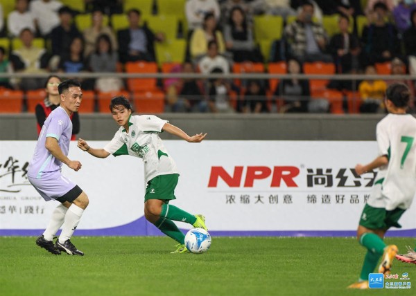 香港精装明星足球队队员和琼中女足明星队队员在比赛中。