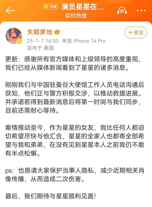 然而,他的女友嘉嘉在社交媒体上发文,首先对官方媒体和上级领导的关注表示感谢,接着提到她仍在等待与王星的会面,但在未见到本人之前,依然不敢放松警惕。