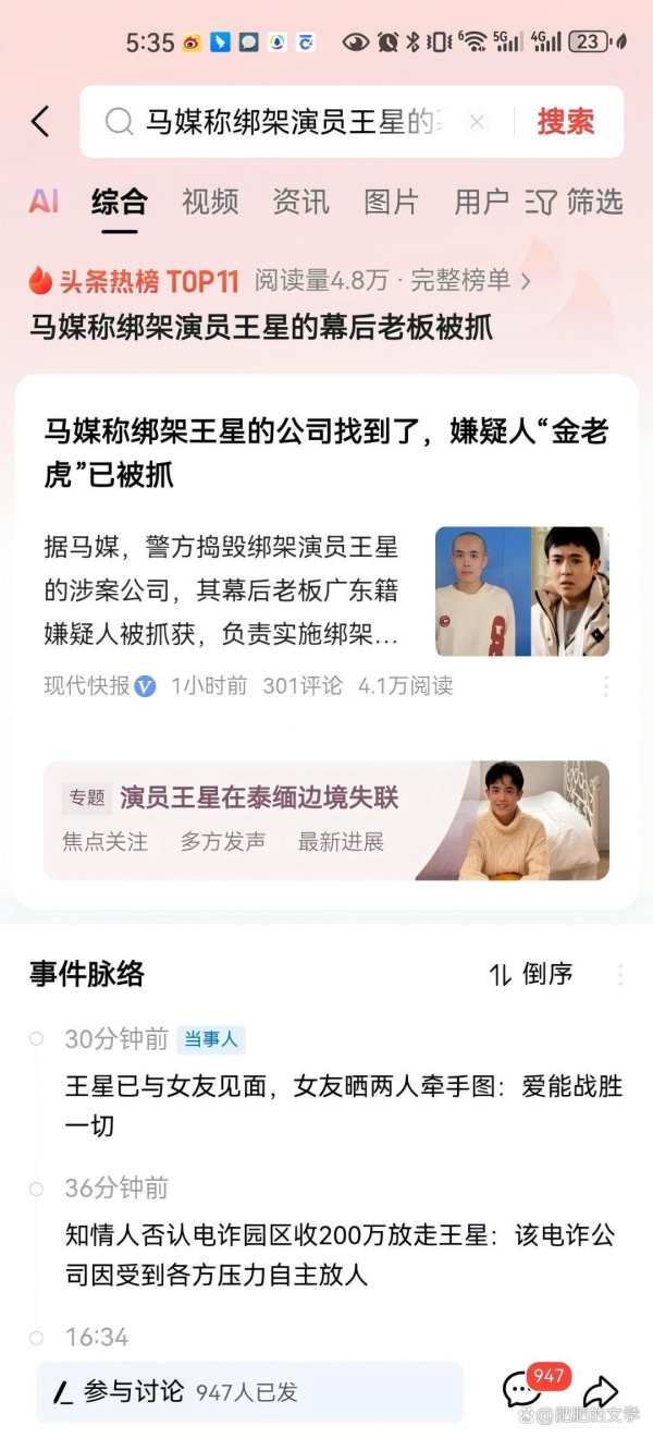 马媒称绑架演员的幕后老板被抓,王星终于与女友见面,晒出牵手照