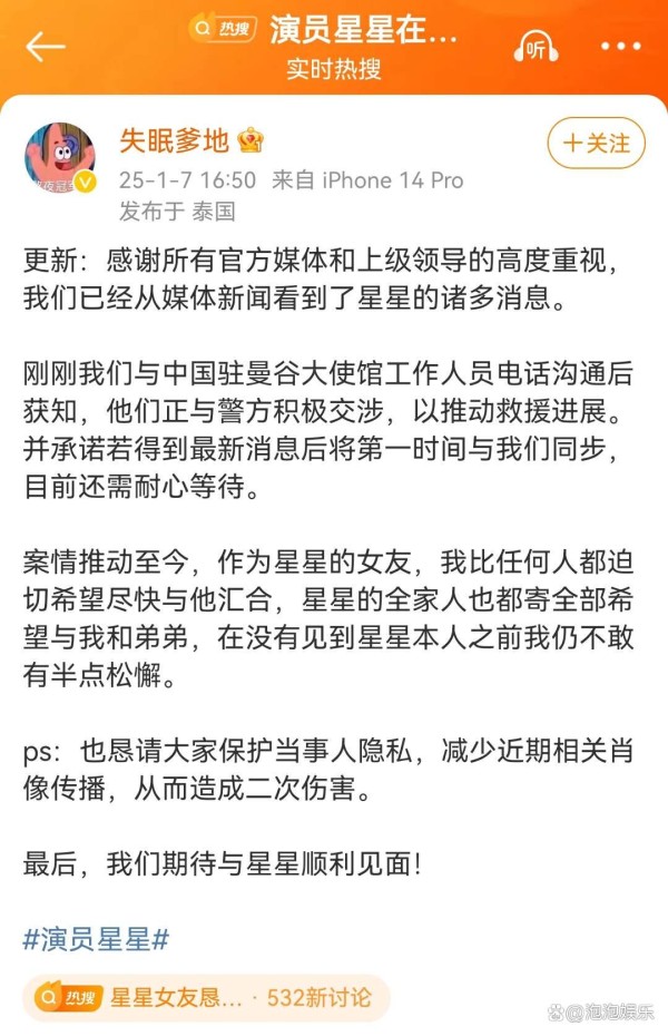 其次,她表示目前仍在等待与王星见面,但在见到本人之前,她丝毫不敢掉以轻心。最后恳请尽量减少对王星近期肖像的传播,以免对他造成二次伤害。