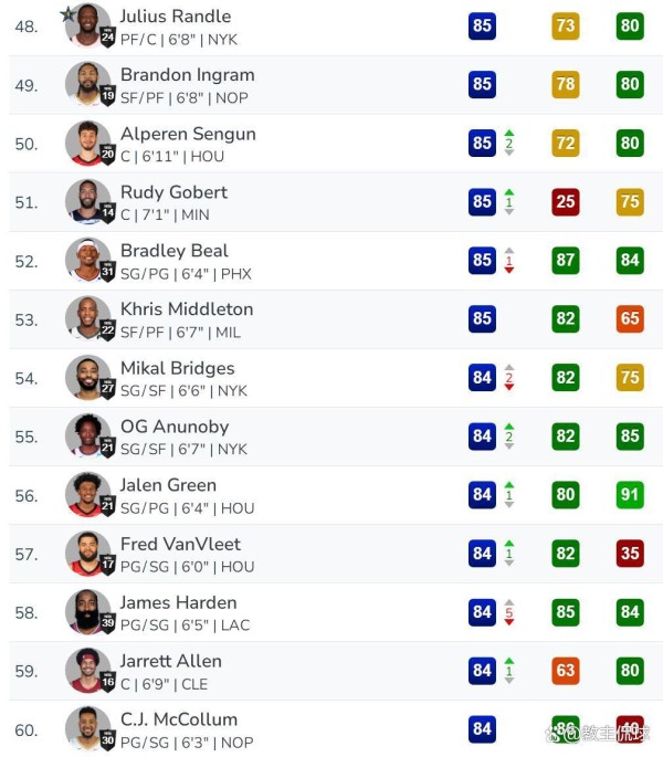 接下来说说哈登,最近2k25公布了全部球星的能力值,哈登84分仅仅排名联盟第58位,同样84分的还有范乔丹、杰伦-格林和CJ等!比尔、米德尔顿、申京、英格拉姆、戈贝尔和兰德尔都是85分,排在哈登之前。大家觉得合理吗?
