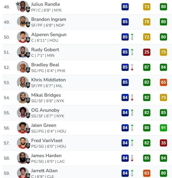 再看一眼,比尔、米德尔顿、申京、英格拉姆、戈贝尔和兰德尔都是85分,这分数就比哈登高那么一点点,直接把他挤到后面去了。大家觉得这评分合理吗?有人会觉得哈登的实力配不上这个分,但也有人会说,这评分挺客观的,毕竟哈登最近的状态确实有起伏。你咋看呢?