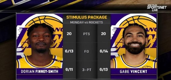 文森特和芬尼-史密斯今天成为奇兵,都命中6记三分,分别砍下20分,合砍40分,他们也成为湖人队史首对单场同时替补投进至少6记三分的队友。芬尼-史密斯出战30分钟,13投6中,三分11中6,罚球2中2,砍下20分6板3助2断3帽,正负值+16全场最高。文森特替补出场24分钟,14投6中,三分13中6,罚球2中2,砍下20分4篮板,正负值+8。
