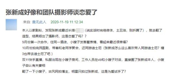 有网友发帖称,张新成疑似和团队摄影师恋爱。同时该网友发布照片。