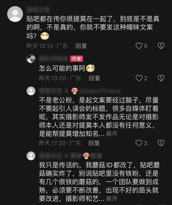 但是,我们是否应该对他们的私人生活保持一定的尊重呢?冯提莫粉丝又出事啦!这次是一位摄影师引起了他们的不满。这位摄影师拍摄了冯提莫的照片,并在发布照片时配上了一些模糊不清的文字。一些“老公粉”发现了这一点,纷纷前去留言质疑,甚至删除了之前发布的帖子。