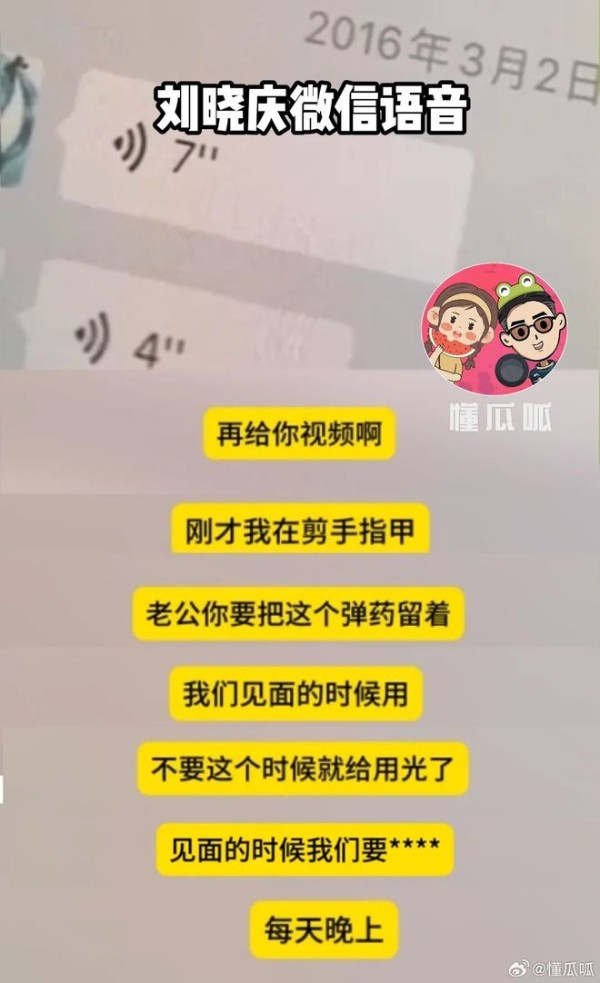 据微博用户@懂瓜呱 爆料刘晓庆早在2015年就婚内出轨业内一位资深摄影师,两人暗中交往了数年,后来刘晓庆与男方一刀两断,为证明所言不虚,该神秘人士提供了刘晓庆与婚外男友的几段微信语音和聊天截图,刘晓庆那沙哑而带有磁性的嗓音一听便知,语音内容相当缠绵炸裂。