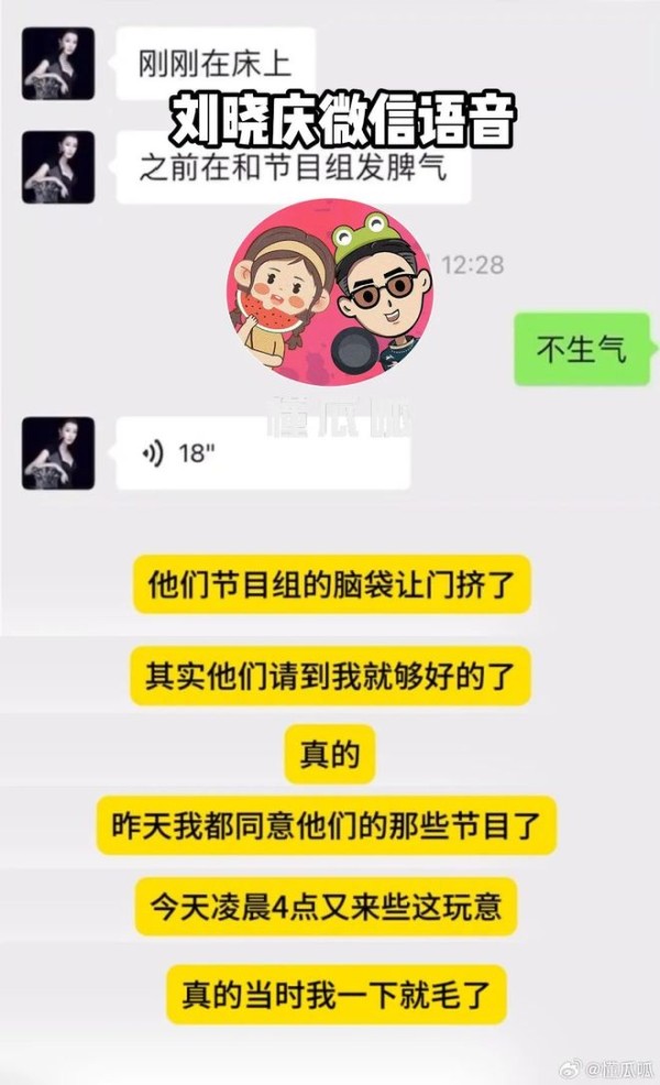 另一段语音中刘晓庆则毫不顾忌跟男友吐槽综艺节目组,而当时刘晓庆录制的综艺节目是浙江卫视的《王牌对王牌》。